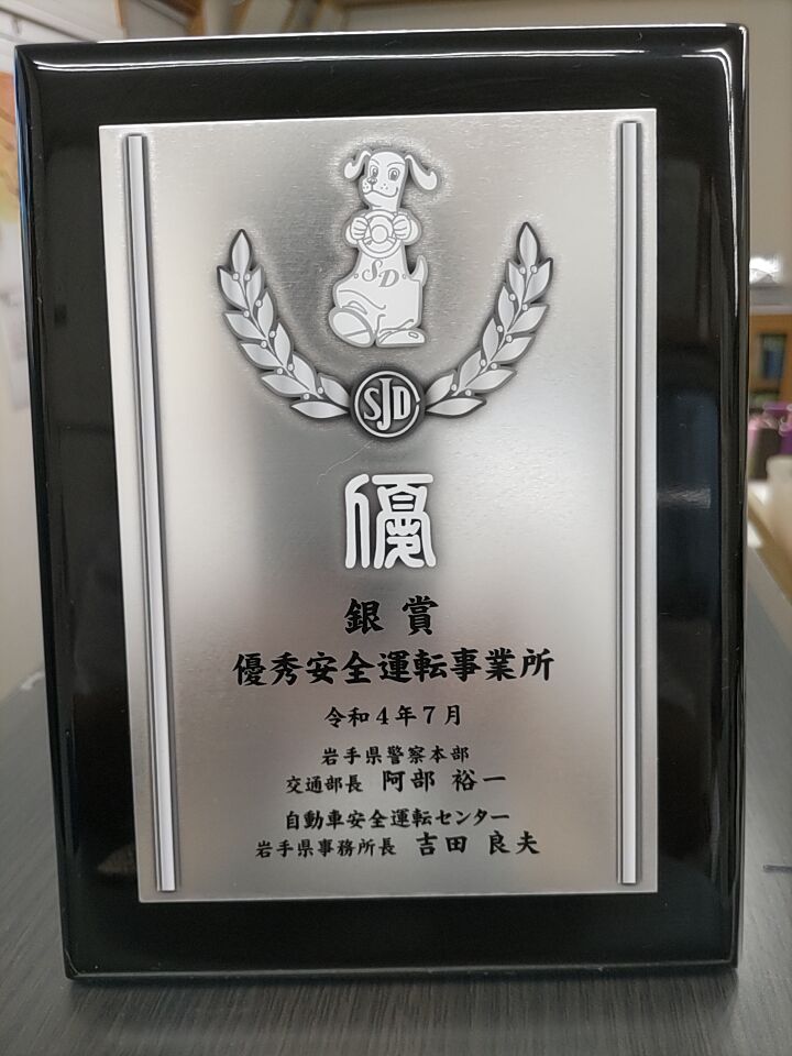 2022.9.12 令和4年7月1日付けで優秀安全運転事業所認定の銀賞を受賞いたしました。